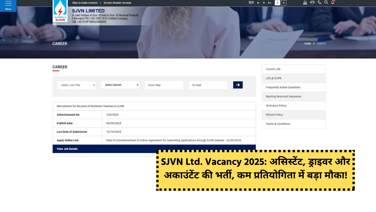 SJVN Vacancy Limited 2025: असिस्टेंट, ड्राइवर और अकाउंटेंट की भर्ती, कम प्रतियोगिता में बड़ा मौका!